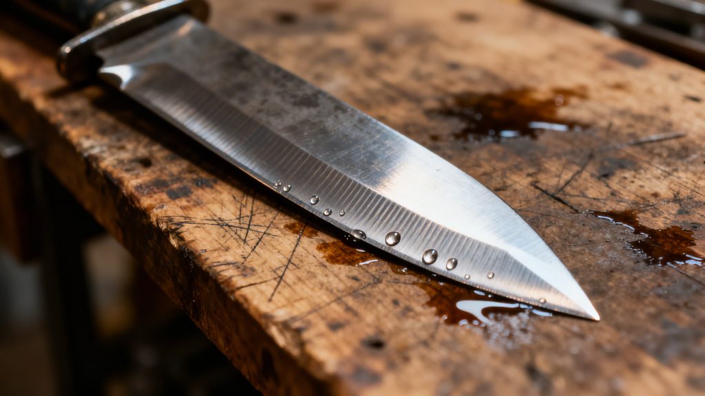 Une lame monosteel bien entretenue est une lame qui dure des décennies. Sa simplicité structurelle est aussi sa simplicité d’entretien. Il n’y a pas d’interface à protéger, pas de jointure à surveiller, pas de risque de décollement ou de délaminage à long terme. L’entretien se résume à ce qu’il a toujours été : affûtage régulier, séchage après usage, application d’une huile protectrice si l’acier est sensible à la corrosion.