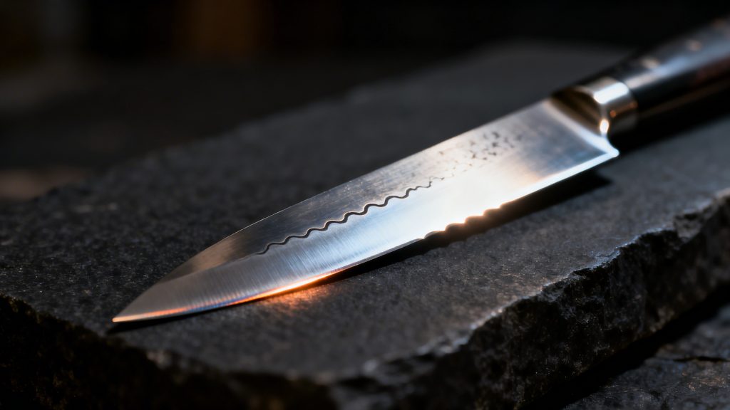 Un acier comme le 1095, avec sa composition simple et sa faible teneur en éléments d’alliage, donnera une lame facile à affûter, au tranchant agressif, mais sensible à la corrosion et relativement fragile sous contrainte latérale. À l’opposé, un acier comme le CPM-S35VN ou le M390 offrira une résistance à l’usure exceptionnelle et une bonne tenue au fil, mais demandera un équipement d’affûtage spécialisé et un coutelier capable de maîtriser un traitement thermique plus exigeant.